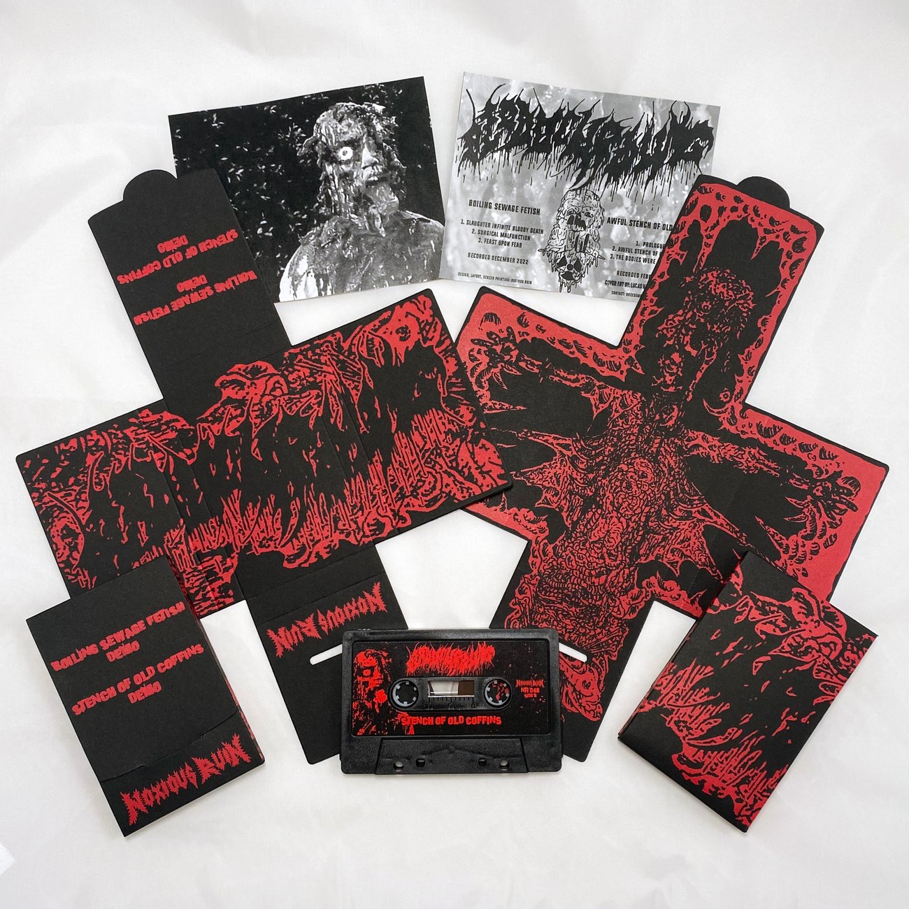This cassette features both demos from Colorado's ugliest lo-fi death metal outfit, BLOODCURDLING (2022's "Boiling Sewage Fetish" & 2023's "Awful Stench of Old Coffins"). What you'll find here is raw, ugly, primitive death metal dripping with tepid contamination. This is a racket so vile and putrid that it'll dissolve you from the inside out and leave your weak ass in a puddle on the floor.
