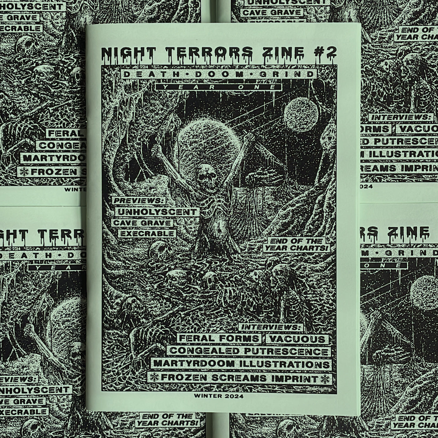 "NIGHT TERRORS ZINE #2 "Winter 2024" is OUT NOW! This seasonal newsletter on paper has the purpose to keep you updated with the current and upcoming releases of the label, with an insight on the Underground Death Metal scene, including bands, label partners and artists."