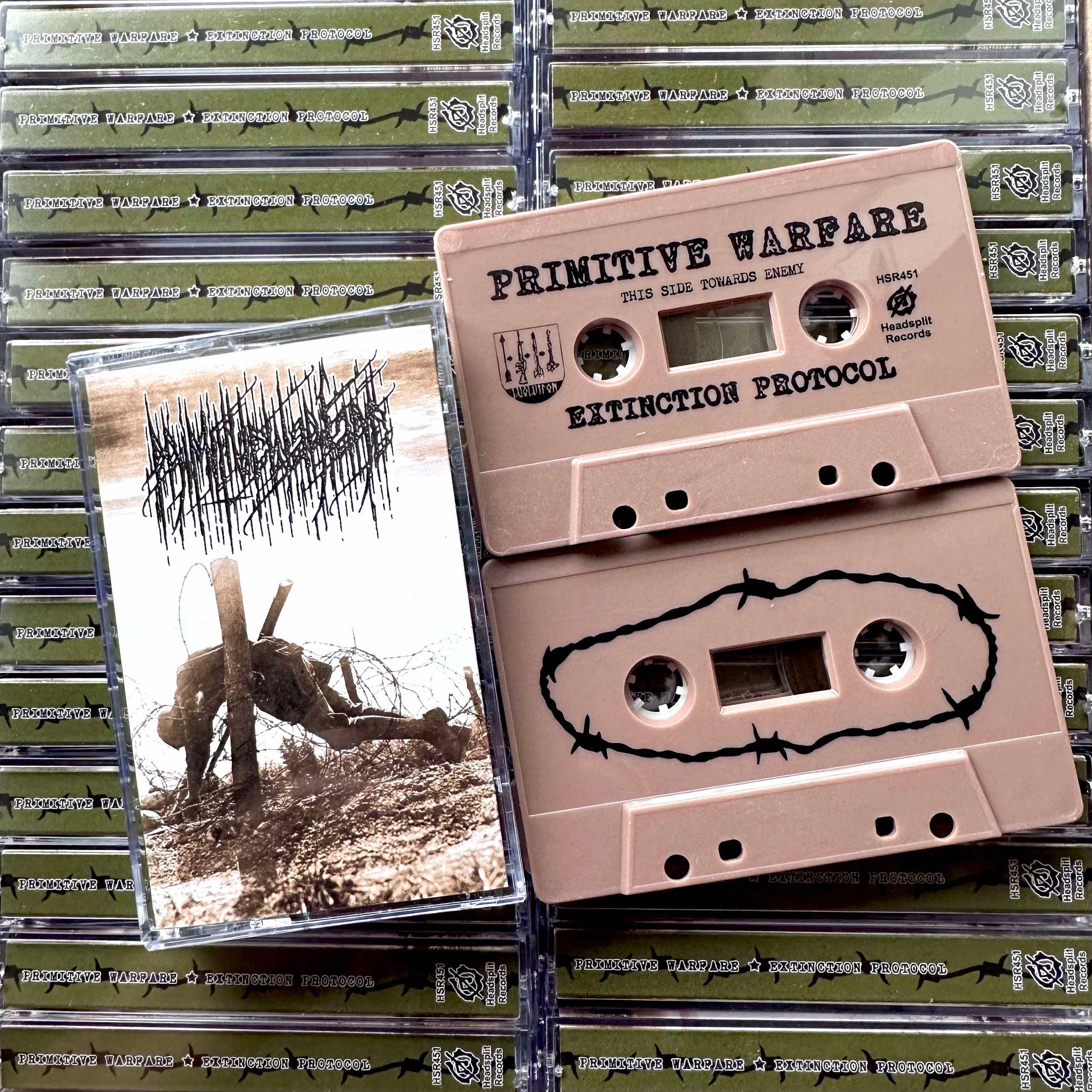 HEADSPLIT RECORDS (Cassette) , STYGIAN BLACK HAND (LP) and GODZ OV WAR PRODUCTIONS (CD) unite in these tenuous times to unveil the debut full-length from war metal operatives PRIMITIVE WARFARE: EXTINCTION PROTOCOL. The goal is to amplify the universal fear of predation innate to our collective unconscious after millenia of intraspecies aggression and prepare us as the planet which birthed us becomes the Tomb of Man.