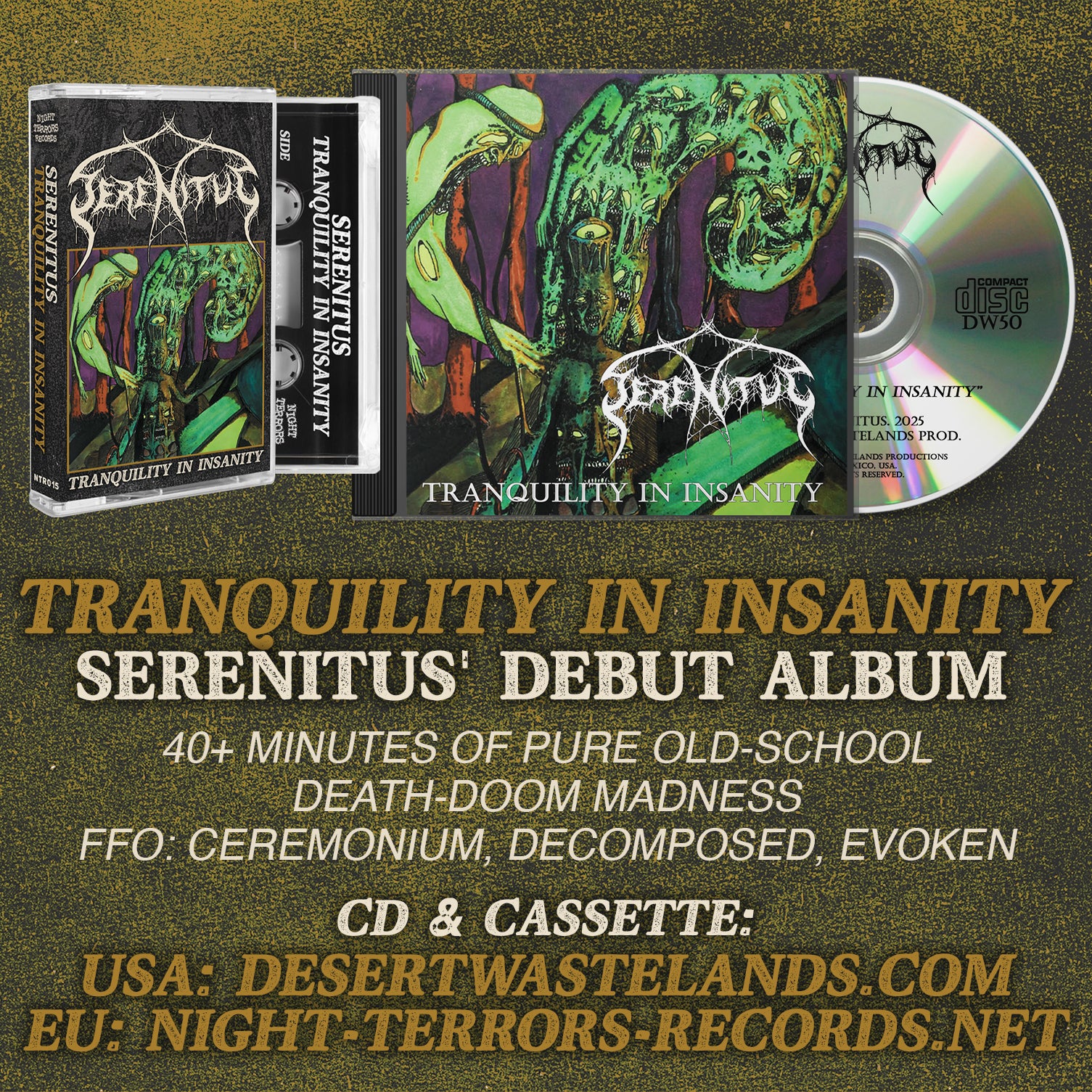 Desert Wastelands Productions and Night Terrors Records are proud to announce the release of "Tranquility In Insanity", the debut album by US Death-Doom one-man band SERENITUS, set to be released on CD and MC format on May 30th, 2025. "Oizys’ Grasp", the first single, is available now on Bandcamp, Youtube and all streaming platforms.